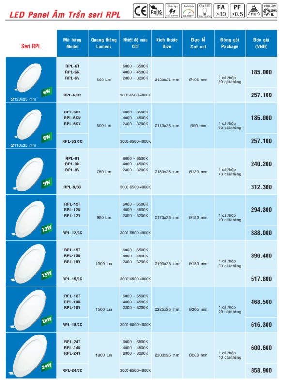 5. Công suất đa dạng: 6W, 9W, 12W, 15W, 18W, 24W.